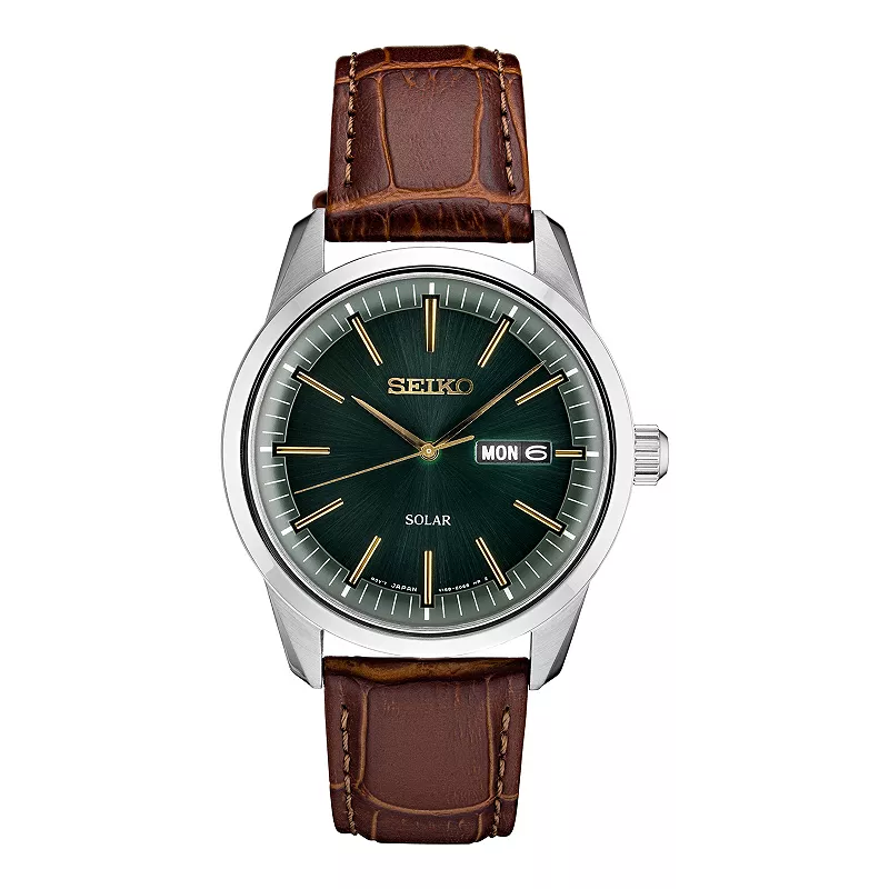 Men's Seiko Solar Essentials Brown Leather Strap Watch 40mm - Watches A dial o... Men's Seiko Solar Essentials Brown Leather Strap Watch 40mm - Watches A dial of deepest green is marked in gold-tone for this warm and winning solar-powered timepiece from Seiko's Essential's collection. Style #SNE529. Movement: three-hand quartz.... more